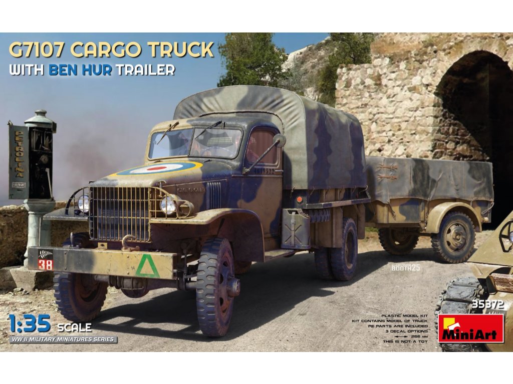 MiniArt 1/35 G7107 Cargo Truck s prívesom "Ben Hur" je detailný model amerického nákladného auta Chevrolet G7107 v mierke 1/35 s prívesom Ben Hur. Tento stroj, vyrábaný počas druhej svetovej vojny, sa používal predovšetkým na prepravu zásob, munície a vojenského materiálu na všetkých frontoch. Stavebnica ponúka realistické prevedenie vozidla a prívesu a je vhodná pre každého, kto chce do svojej zbierky pridať ikonické spojenecké logistické vozidlo.