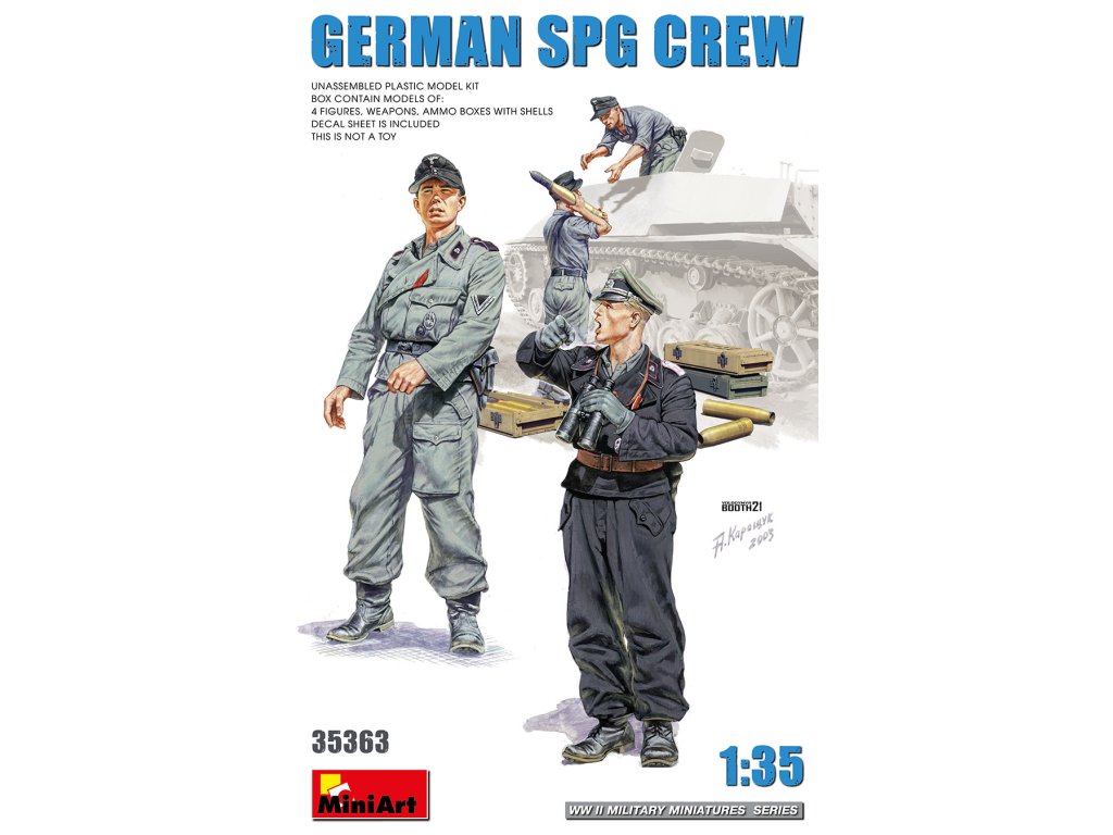 MiniArt 1/35 German SPG Crew je figúrka posádky nemeckého samohybného dela z obdobia druhej svetovej vojny, ideálna pre diorámy alebo tankové scény. Balenie neobsahuje farby ani lepidlo potrebné na zostavenie.