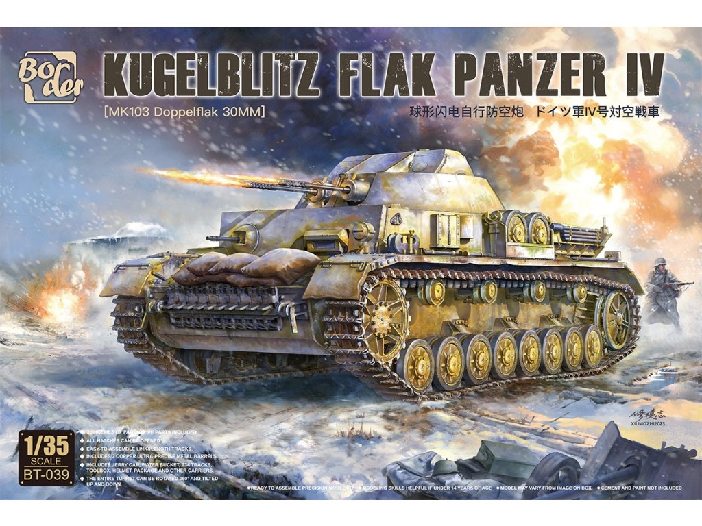 Border Model 1/35 Kugelblitz Flak Panzer IV (MK103 Doppelflak 30mm) je model experimentálnej samohybnej protilietadlovej zbrane na podvozku tanku Panzer IV. Tento unikátny stroj bol vyzbrojený dvojicou 30 mm kanónov MK103 v úplne uzavretej guľovej veži. Balenie neobsahuje farby ani lepidlo potrebné na montáž.