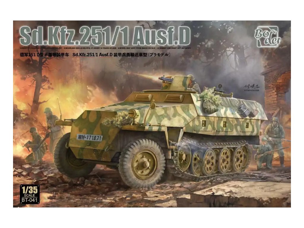 Border Model 1/35 Sd.Kfz.251/1 Ausf.D je detailný model nemeckého obrneného transportéra z druhej svetovej vojny. Táto neskoršia verzia bola nasadená na všetkých frontoch od roku 1943 a slúžila na prepravu pechoty, ako aj ako základ pre rôzne špecializované varianty. Balenie neobsahuje farby ani lepidlá potrebné na zostavenie.