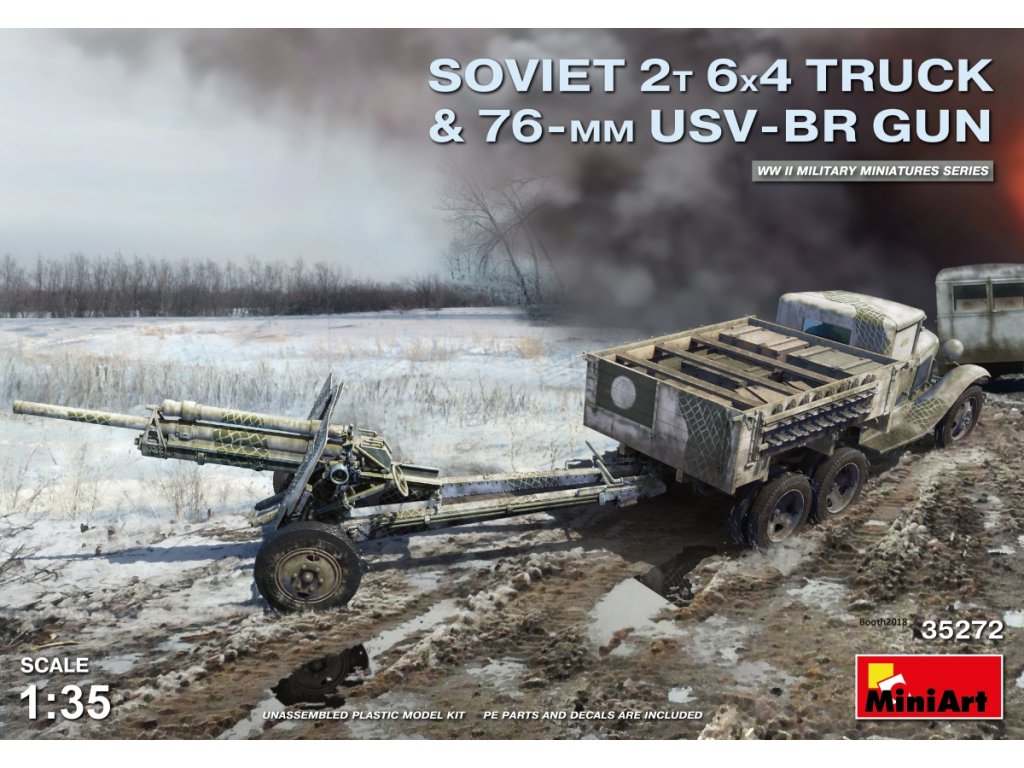 Model sovietskeho nákladného auta 2 t 6x4 so 76 mm kanónom USV-BR od MiniArtu v mierke 1/35 predstavuje sovietske ľahké nákladné auto s vlečeným 76 mm kanónom USV-BR z druhej svetovej vojny. Stavebnica obsahuje detailné plastové diely vrátane interiéru nákladného vozidla, výzbroje a vybavenia. Balenie neobsahuje farby ani lepidlo potrebné na zostavenie.