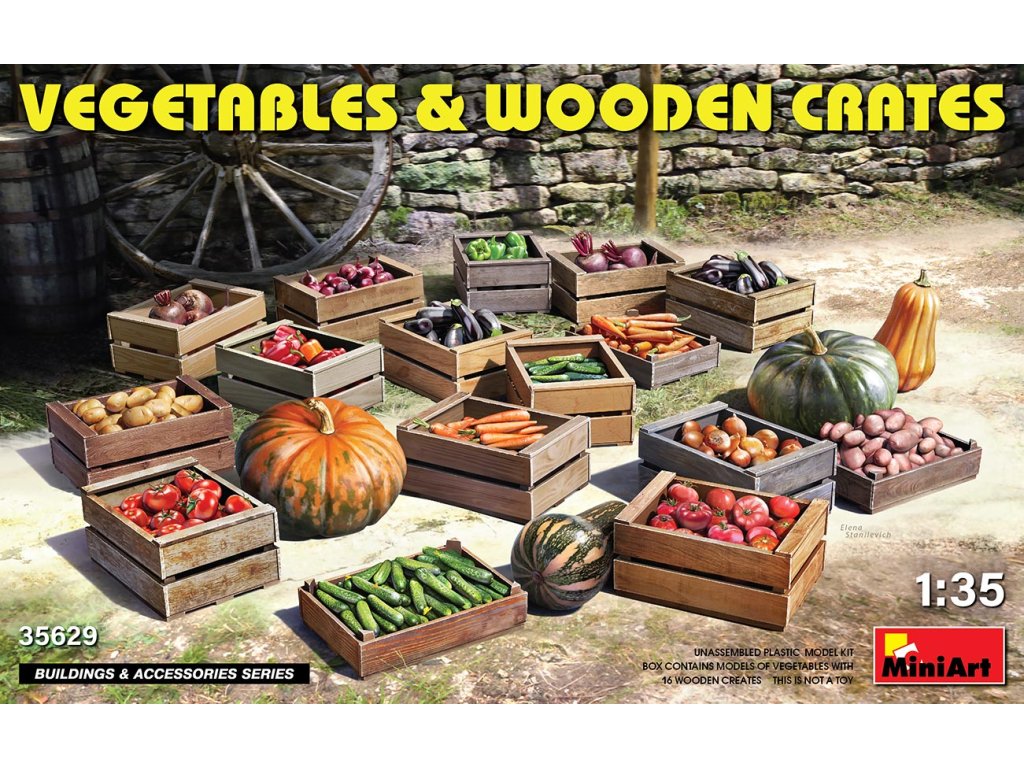 Sada MiniArt Zelenina a drevené debny v mierke 1/35 obsahuje plastové diely na zostavenie realistických drevených debien naplnených rôznou zeleninou, ako je kapusta, paradajky, cibuľa, mrkva, zemiaky a tekvica. Jednotlivé kusy zeleniny sú vykreslené s dôrazom na prirodzený tvar a povrchovú štruktúru, čo umožňuje jednoduché začlenenie do rôznych scén.