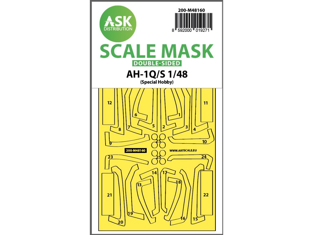 Obojstranná priehľadná maska a masky kolies pre stavebnicu Special Hobby 1/48 Bell AH-1Q/S, katalógové číslo 200-M48160. Predseknutá maskovacia fólia Kabuki najvyššej kvality, najlepšia technologická výroba prierezu fólie. Všetky časti masky sú potlačené číslami, ktoré spolu s návodom určujú presnú polohu, môžua aplikáciu na maskovaný model - veľké uľahčenie práce vedúce k dokonalému modelu.