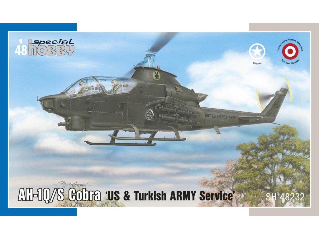 Model AH-1Q/S Cobra "US & Turkish Army Service" v mierke 1/48 od Special Hobby predstavuje útočný vrtuľník používaný armádami Spojených štátov a Turecka počas studenej vojny. Stavebnica obsahuje detailné plastové diely, kokpit, výzbroj a obtlačky pre americké aj turecké stroje. Balenie neobsahuje farby ani lepidlo potrebné na zostavenie.