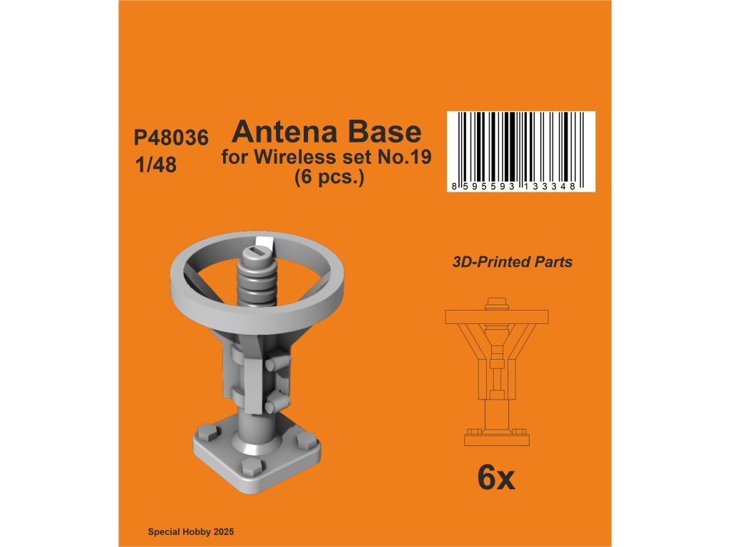 Anténna základňa pre bezdrôtovú súpravu č. 19 od CMK v mierke 1/48 je určená na doplnenie detailných modelov britských a spojeneckých obrnených vozidiel vybavených štandardnou vysielačkou WS č. 19.Táto rádiostanica bola bežnou súčasťou výzbroje tankov, obrnených vozidiel a veliteľských stanovíšť britských síl počas 2. svetovej vojny.