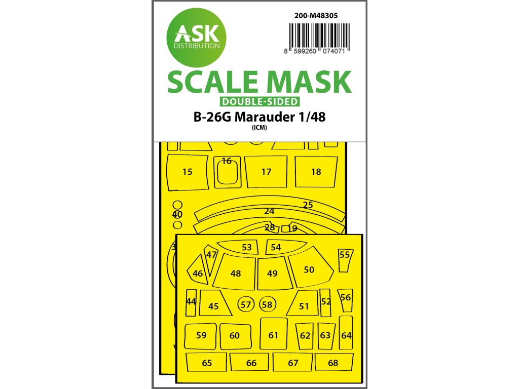 Obojstranná samolepiaca maska z priehľadných dielov pre stavebnicu ICM 1/48 B-26G Marauder. Katalógové číslo ASK Distribution: 200-M48305