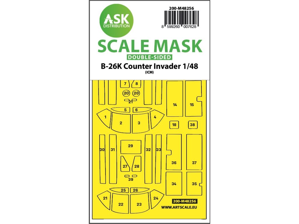 Obojstranná samolepiaca maska priehľadných dielov a podvozkových kolies pre stavebnicu ICM 1/48 B-26K Counter Invader. Katalógové číslo ASK Distribution: 200-M48256