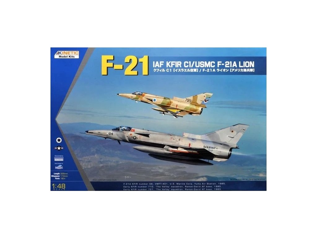 Kinetic 1/48 F-21 IAI Kfir C1/USMC F-21A Lion je model izraelského stíhacieho lietadla Kfir C1 a jeho americkej verzie F-21A Lion, ktorú používa americká námorná pechota ako cvičné lietadlo. Balenie neobsahuje farby ani lepidlo potrebné na zostavenie.