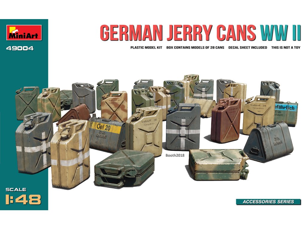 Model MiniArt German Jerry Cans WW2 v mierke 1/48 predstavuje sadu nemeckých kanistrov používaných počas 2. svetovej vojny. Dokonale sa hodí ako doplnok pre vojenské diorámy a modely vozidiel. Balenie neobsahuje farby ani lepidlo potrebné na zostavenie.