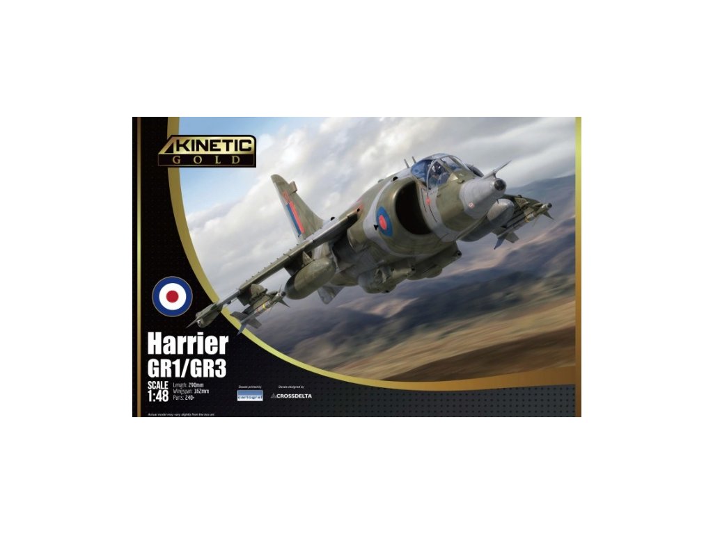 Kinetic 1/48 Harrier GR1/GR3 je model britského útočného lietadla s kolmým vzletom a pristátím, ktoré bolo nasadené počas studenej vojny a vojny o Falklandy. Balenie neobsahuje farby ani lepidlo potrebné na zostavenie.
