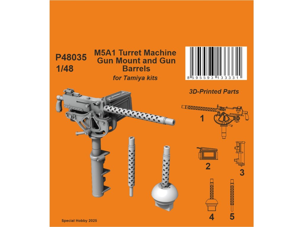 Sada guľometu M5A1 Turret Mount and Gun Barrels v mierke 1/48 od spoločnosti CMK obsahuje vysoko realistické príslušenstvo vyrobené modernou technológiou 3D tlače. Je určená pre modely ľahkých tankov M5A1 Stuart (napr. Tamiya) a nahrádza zjednodušené plastové diely stavebnice.