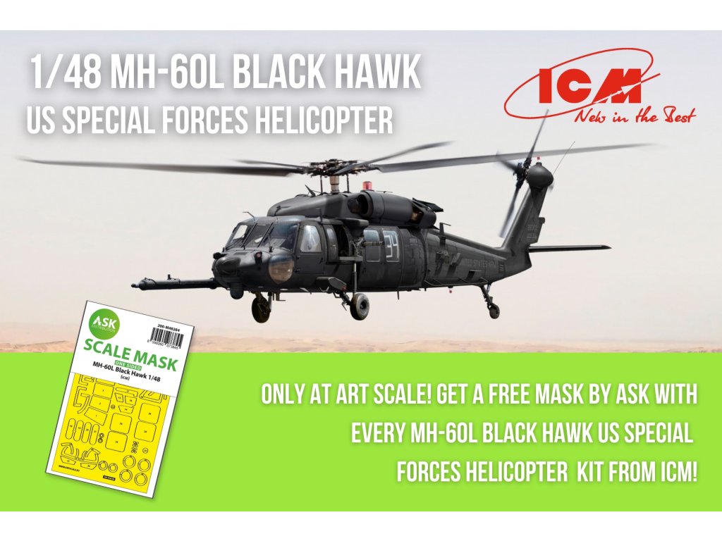 Stavebnica 1/48 MH-60L Black Hawk, vrtuľník amerických špeciálnych síl od spoločnosti ICM zobrazuje špeciálne upravený variant slávneho vrtuľníka Sikorsky UH-60 Black Hawk, ktorý bol vyvinutý pre špeciálne operácie americkej armády. Verzia MH-60L bola vybavená pokročilými elektronickými systémami, pancierom a prídavnými zbraňami, vďaka čomu je ideálna na nočné misie, prepravu špeciálnych jednotiek a bojovú podporu.