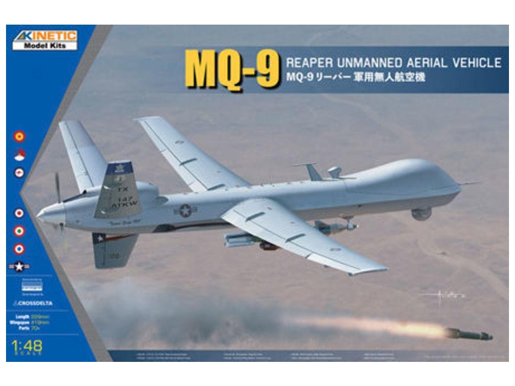 Kinetic 1/48 MQ-9 Reaper w/GBU-12 je model moderného bezpilotného bojového lietadla používaného najmä americkým letectvom a CIA. Tento variant je vybavený laserom navádzanými bombami GBU-12. Balenie neobsahuje farby ani lepidlo potrebné na zostavenie.