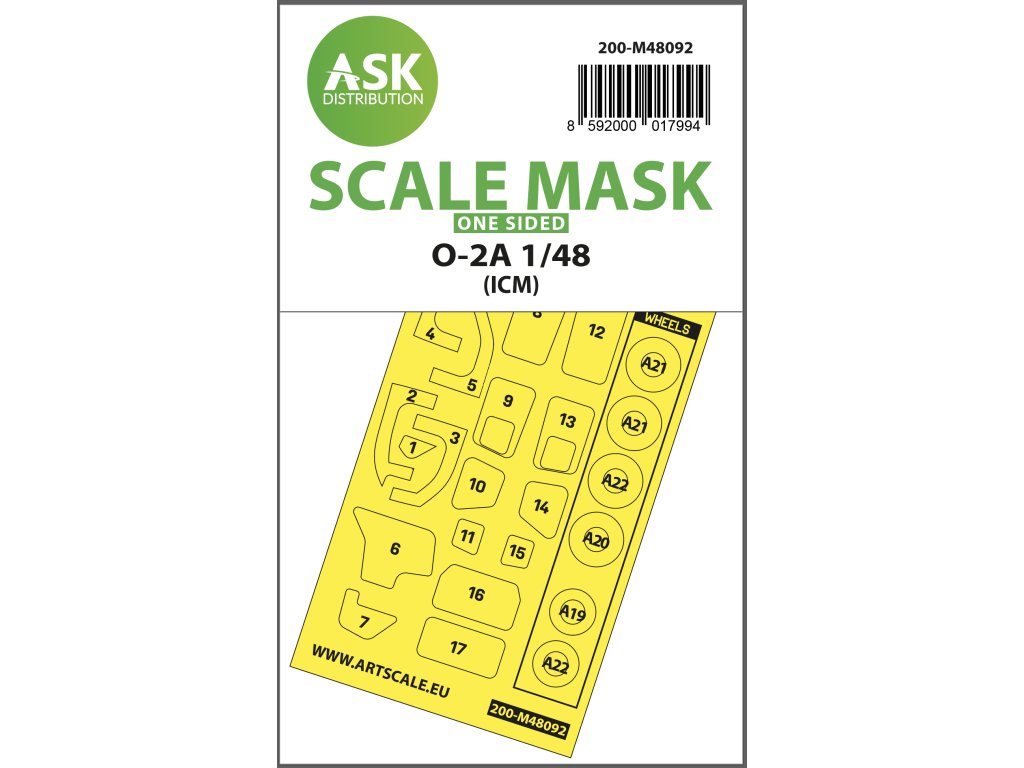 Jednostranná samolepiaca maska 1/48 O-2A s priehľadnými dielmi a maskami kolies pre stavebnicu ICM, katalógové číslo 200-M48092. Predseknutá maskovacia fólia Kabuki najvyššej kvality, najlepšia technologická výroba prierezu fólie. Všetky časti masky potlačené číslami, ktoré spolu s návodom určujú presnú polohu, môžua aplikáciu na maskovaný model - veľké uľahčenie práce vedúce k dokonalému modelu.