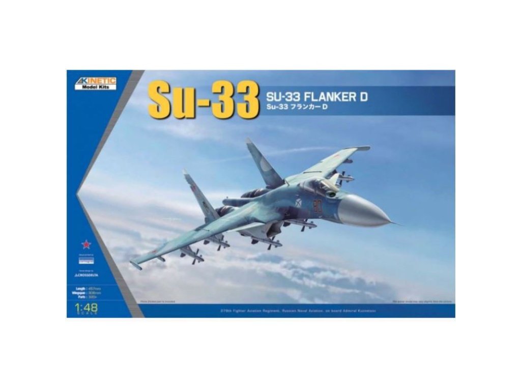 Kinetic 1/48 Su-33 Flanker D je model sovietskeho palubného stíhacieho lietadla určeného pre operácie na lietadlových lodiach, ktorý vychádza z konštrukcie Su-27. Balenie neobsahuje farby ani lepidlo potrebné na zostavenie.