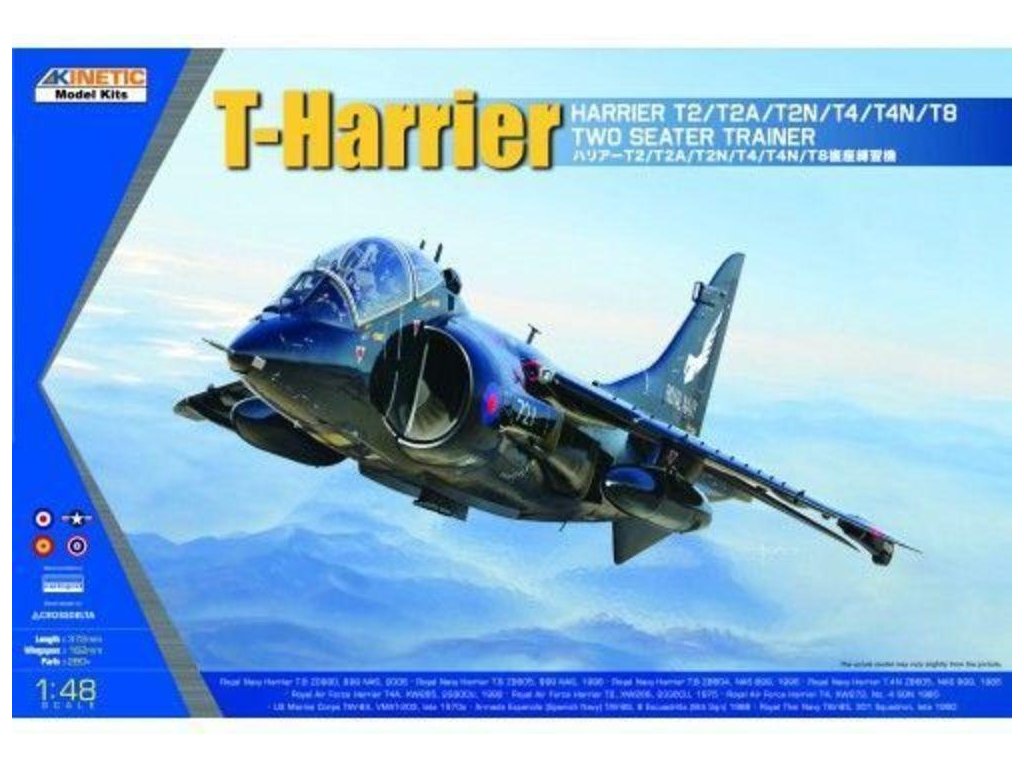 Kinetic 1/48 T-Harrier T2/T4/T8 je detailný model britského cvičného lietadla s možnosťou kolmého štartu a pristátia. Stroj sa používal na výcvik pilotov lietadiel Harrier a slúžil v Kráľovskom námorníctve aj v RAF. Stavebnica ponúka precízne detaily, pestrý výber kamufláží a moderné spracovanie. Balenie neobsahuje farby ani lepidlo potrebné na zostavenie.