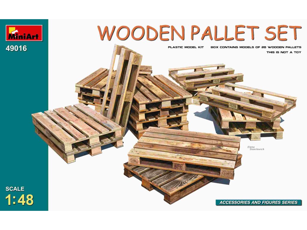 Sada drevených paliet MiniArt v mierke 1/48 je sada realisticky stvárnených drevených paliet vhodných pre vojenské a civilné diorámy. Balenie neobsahuje farby ani lepidlo potrebné na montáž.