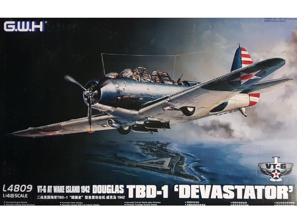 Model lietadla Douglas TBD-1 "Devastator" VT-6 na ostrove Wake 1942 od spoločnosti GWH v mierke 1/48 predstavuje americký torpédový bombardér, ktorý sa v roku 1942 zúčastnil útoku na ostrov Wake. Stavebnica obsahuje detailné plastové diely exteriéru a interiéru vrátane realistického kokpitu, podvozkových šácht a výzbroje. Súčasťou sú aj obtlačky pre kamufláž lietadla letky VT-6 z lietadlovej lode USS Enterprise (CV-6). Balenie neobsahuje farby ani lepidlo potrebné na zostavenie.