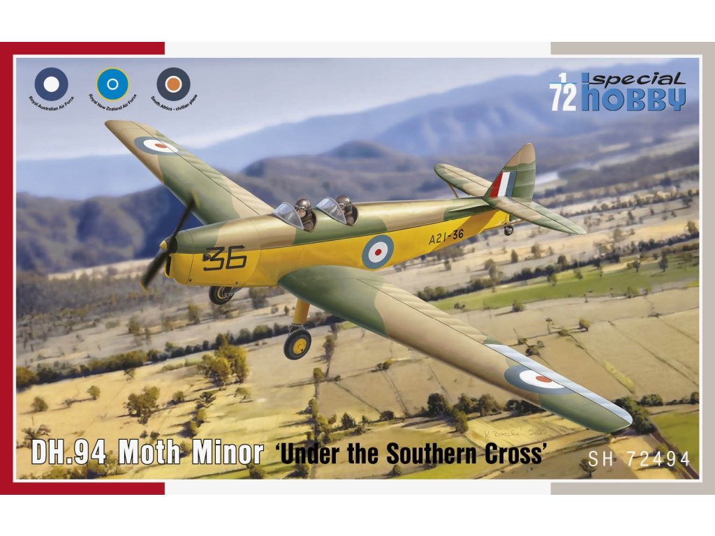 Plastikový model britského dvojmiestneho cvičného a turistického lietadla de Havilland DH.94 Moth Minor v mierke 1/72. Toto elegantné nízko lietajúce lietadlo bolo navrhnuté ako moderná náhrada za slávny rad Moth a používalo sa na výcvik pilotov počas druhej svetovej vojny. Edícia "Pod južným krížom" sa zameriava na stroje prevádzkované na južnej pologuli, vrátane kamufláží Kráľovského austrálskeho letectva (RAAF) a Kráľovského novozélandského letectva (RNZAF), ako aj atraktívnych civilných verzií Juhoafrického letectva (SAAF). Stavebnica od Special Hobby obsahuje kvalitné výlisky, priehľadné diely a obtlačky pre štyri zaujímavé označenia.
