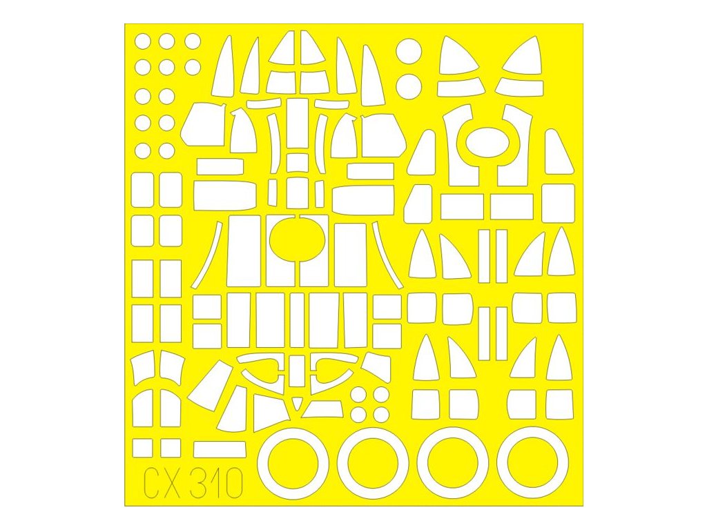 Obojstranná (vonkajšia a vnútorná) maska čírych dielov a kolies pre stavebnicu Das Werk 1/32 Messerschmitt P.1101. Katalógové číslo ASK...