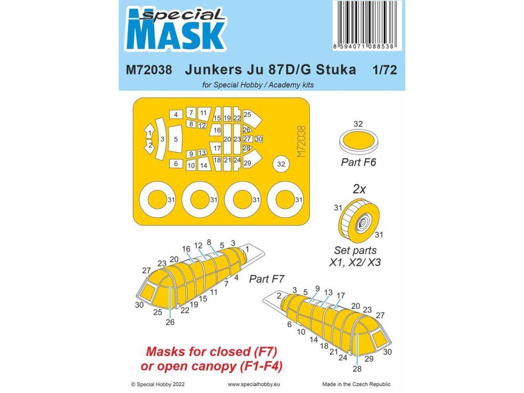 Sada kamuflážnych šablón pre Junkers Ju 87D/G Stuka v mierke 1/72 od Special Hobby je určená pre modely Special Hobby a Academy. Umožňuje presné maskovanie kokpitu a ďalších priehľadných častí modelu počas maľovania. Šablóny presne zodpovedajú tvarom skla, čo uľahčuje nanášanie farby a zabezpečuje ostré línie farby. Vyrobené z vysokokvalitného materiálu, ktorý sa ľahko aplikuje a odstraňuje. Balenie neobsahuje farby ani lepidlá potrebné na montáž.