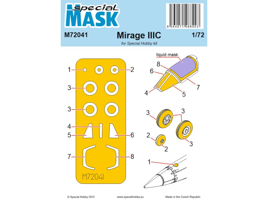 Táto sada kamuflážnych šablón pre Mirage IIIC v mierke 1/72 od Special Hobby vám umožní presne zamaskovať kokpit a ďalšie priehľadné časti modelu počas maľovania. Šablóny presne kopírujú tvary skla, uľahčujú nanášanie farby a zabezpečujú ostré línie farby. Vyrobené z vysokokvalitného materiálu, ktorý sa ľahko aplikuje a odstraňuje. Balenie neobsahuje farby ani lepidlá potrebné na montáž.