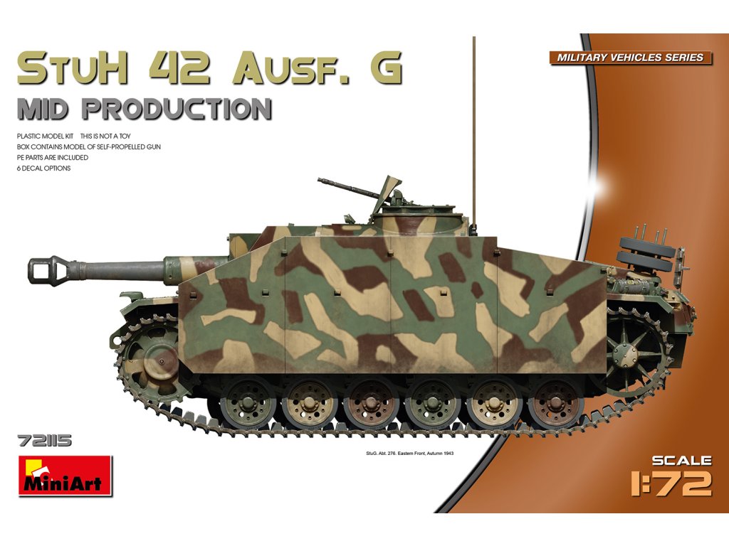 Model MiniArt 1/72 StuH 42 Ausf. G Mid Prod ponúka verné malometrážne stvárnenie tohto variantu. Obsahuje detailné povrchové štruktúry, výzbroj, podvozok a ďalšie konštrukčné prvky špecifické pre strednú sériu výroby. Stavebnica je ideálna pre modelárov, ktorí sa zaujímajú o nemecké obrnené vozidlá z druhej svetovej vojny v kompaktnej mierke vhodnej pre väčšie diorámy.