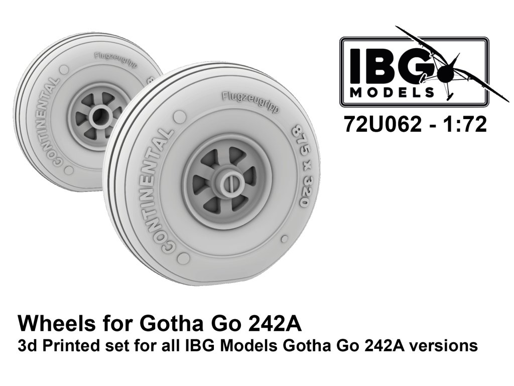 IBG 1/72 Wheels for Gotha Go-242A je sada v mierke 1/72 obsahujúca detailné kolesá pre nemecký transportný klzák Gotha Go 242A z druhej svetovej vojny. Je určená na nahradenie jednoduchších dielov stavebnice.