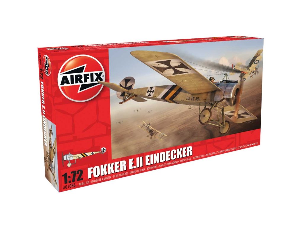 Stavebnica Airfix Classic Kit A01086 Fokker E.II Eindecker je model slávneho nemeckého stíhacieho lietadla zo začiatku prvej svetovej vojny v mierke 1/72. Tento typ sa preslávil ako prvé lietadlo s účinným synchronizovaným guľometom strieľajúcim nad vrtuľou. Balenie neobsahuje farby ani lepidlo potrebné na zostavenie.