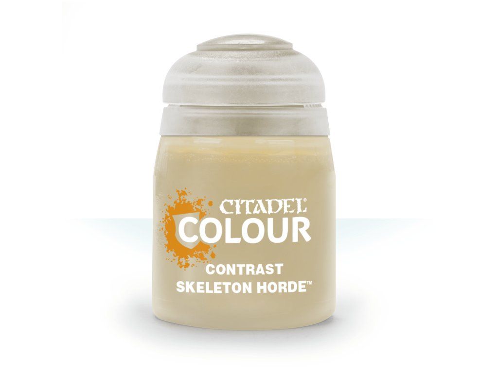 Contrast: Skeleton Horde je súčasťou revolučného radu farieb Contrast od spoločnosti Citadel, ktorý zásadne mení prístup k maľovaniu miniatúr. Tieto farby spájajú vlastnosti základnej farby, tieňovania a zvýrazňovania do jedného produktu, čo umožňuje aj menej skúseným maliarom dosiahnuť profesionálne vyzerajúce výsledky za podstatne kratší čas.