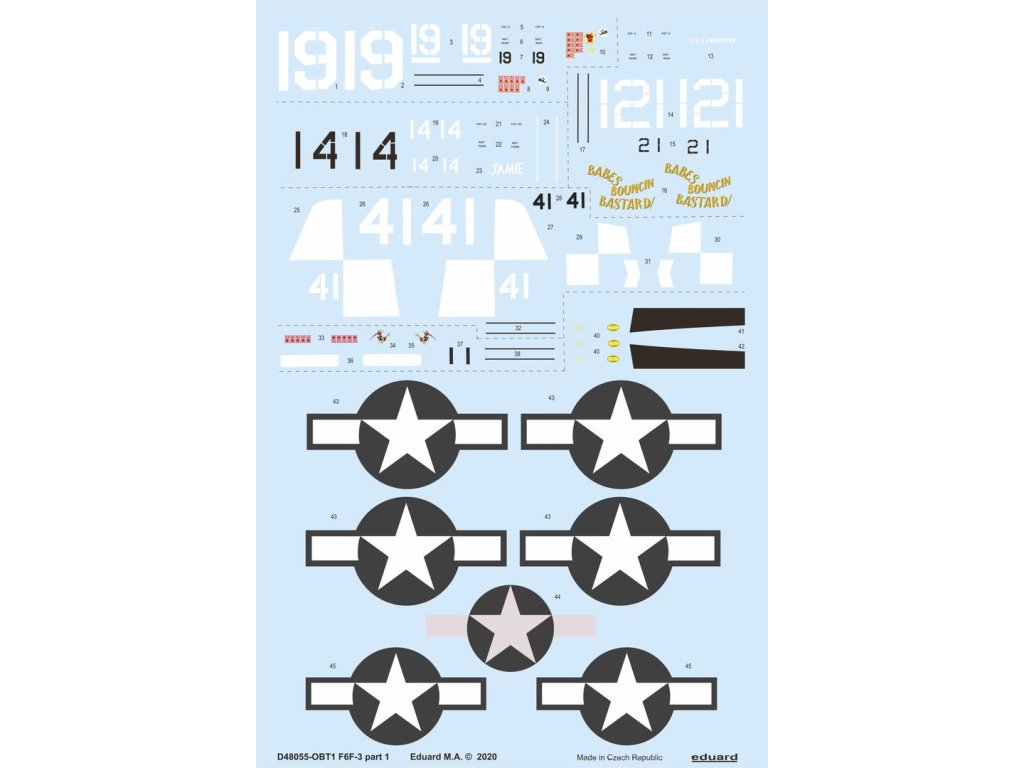 Obojstranná samolepiaca maska 1/48 F6F-3 Hellcat s čírymi dielmi a kolesami pre stavebnicu Eduard. Katalógové číslo ASK Distribution: 200-M48199...