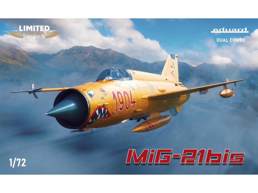 Stavebnica Eduard MiG-21bis DUAL COMBO v mierke 1/72 zobrazuje dve verzie slávneho sovietskeho stíhacieho lietadla z obdobia studenej vojny. Obsahuje širokú škálu obtlačkov, detailných dielov a výzbroje. Balenie neobsahuje farby ani lepidlo potrebné na zostavenie.