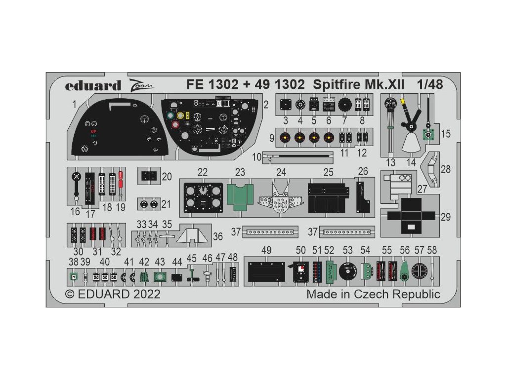 Jednostranná samolepiaca priehľadná maska na diely a masky kolies pre stavebnicu Airfix 1/48 Spitfire Mk.XII, katalógové číslo 200-M48102. Obsahuje...